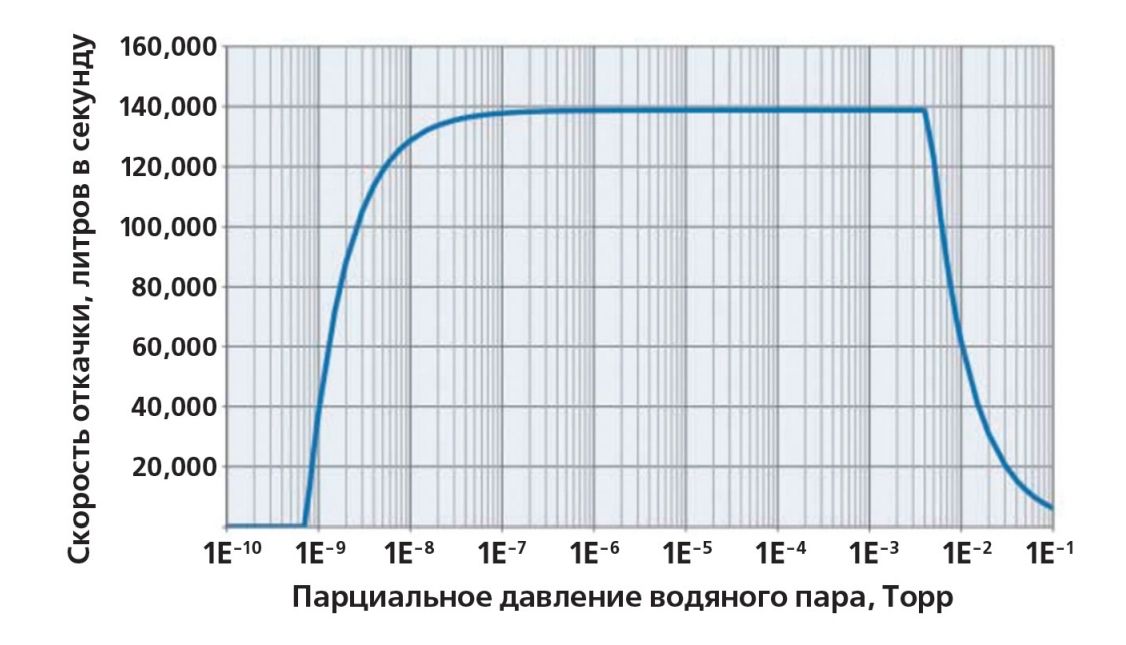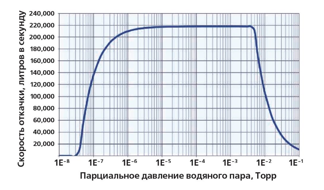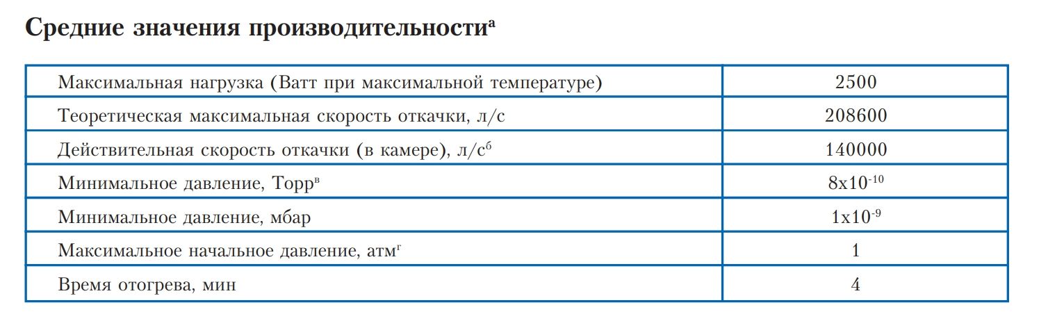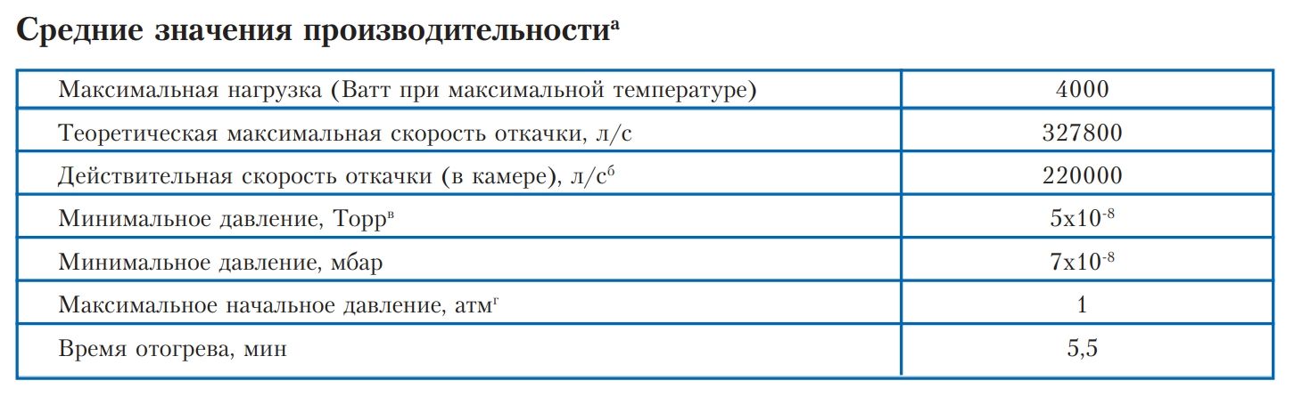 - Конденсирует водяной пар в вакуумных системах со скоростью 140 000 л/с до давлений порядка 8 x 10-10 Торр (1 x 10-9 мбар)