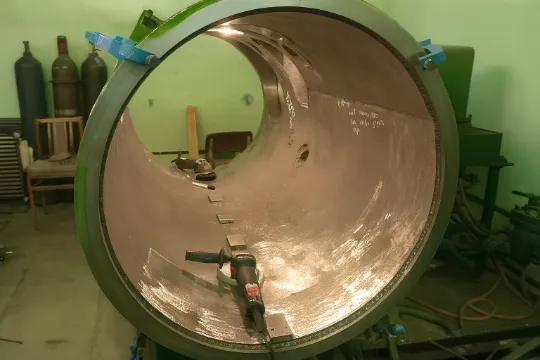 По такой же схеме были отполированы фланцы и выдвижной стол. К фланцам крышек были приварены элементы для установки нового технологического оборудования, а на обечайке камеры найдены и исправлены дефекты сварных швов, очищены и убраны старые элементы из свинца. Все поверхности канавок предварительно подготовлены под монтаж резиновых уплотнений из витона вместо установленных штатных из «белой вакуумной резины».